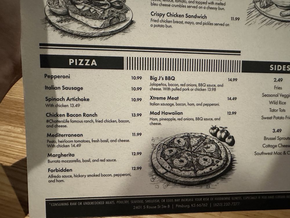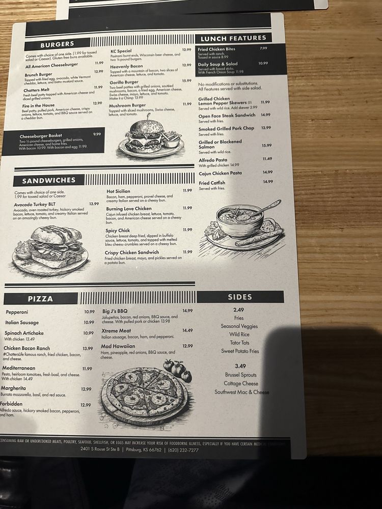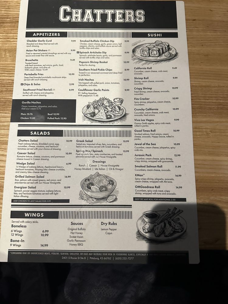 Introducing Chatters, a unique dining experience combining sports bar vibes, New American cuisine, and sushi offerings. Located in Pittsburg, KS, Chatters provides a range of amenities such as outdoor seating, happy hour specials, and a full bar. The menu diversity surprises customers, with options from burgers to sushi. Reviews praise the delicious bone-in wings, hearty burgers, and friendly and knowledgeable staff. The atmosphere, although a bit dark, is cozy and inviting. Customers appreciate the generous portions, fresh flavors, and excellent desserts. Despite being a bit pricey, Chatters earns praise for its personable service and range of dishes, from basic bar food to Pho. For a local gem with a welcoming atmosphere and diverse menu, Chatters is a must-visit.